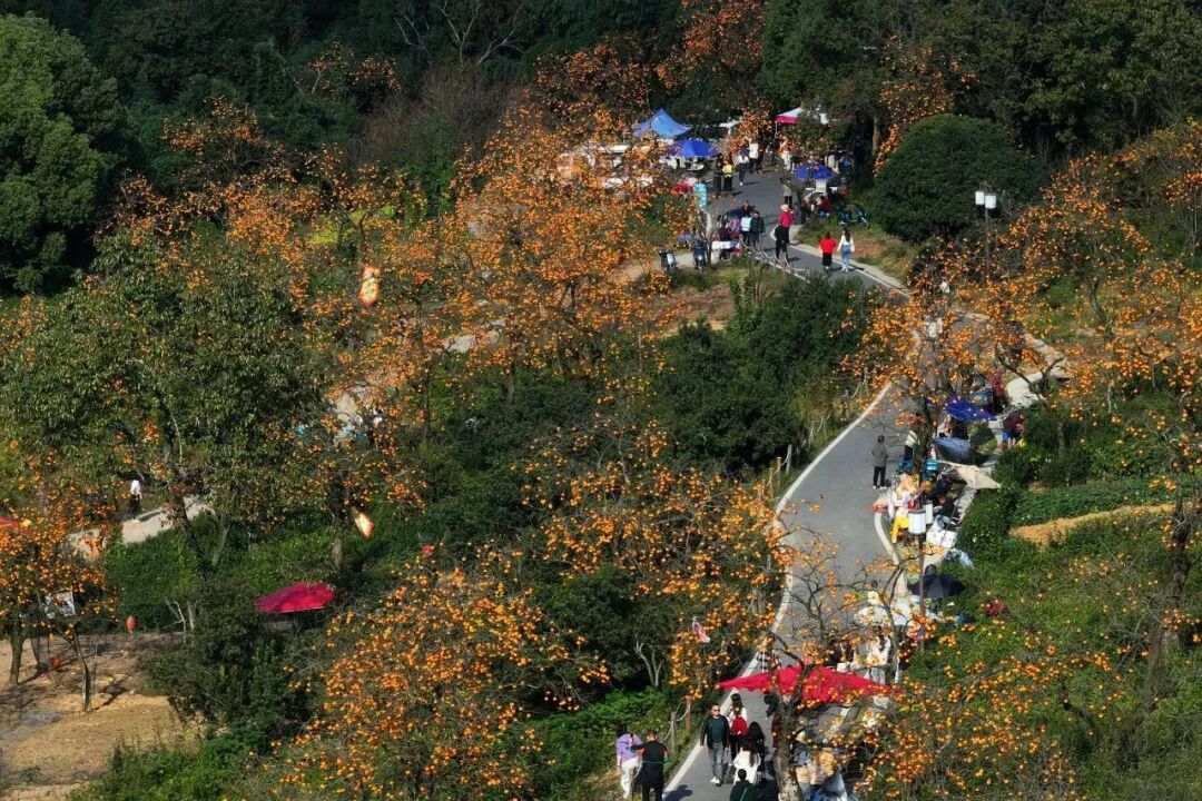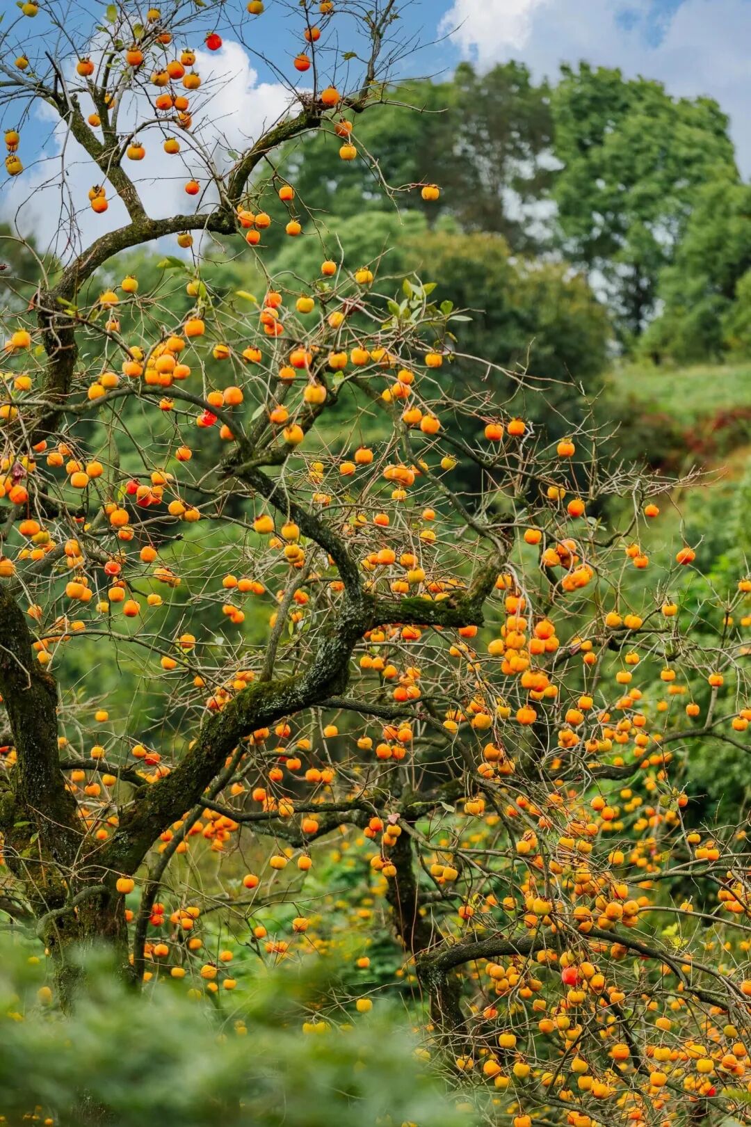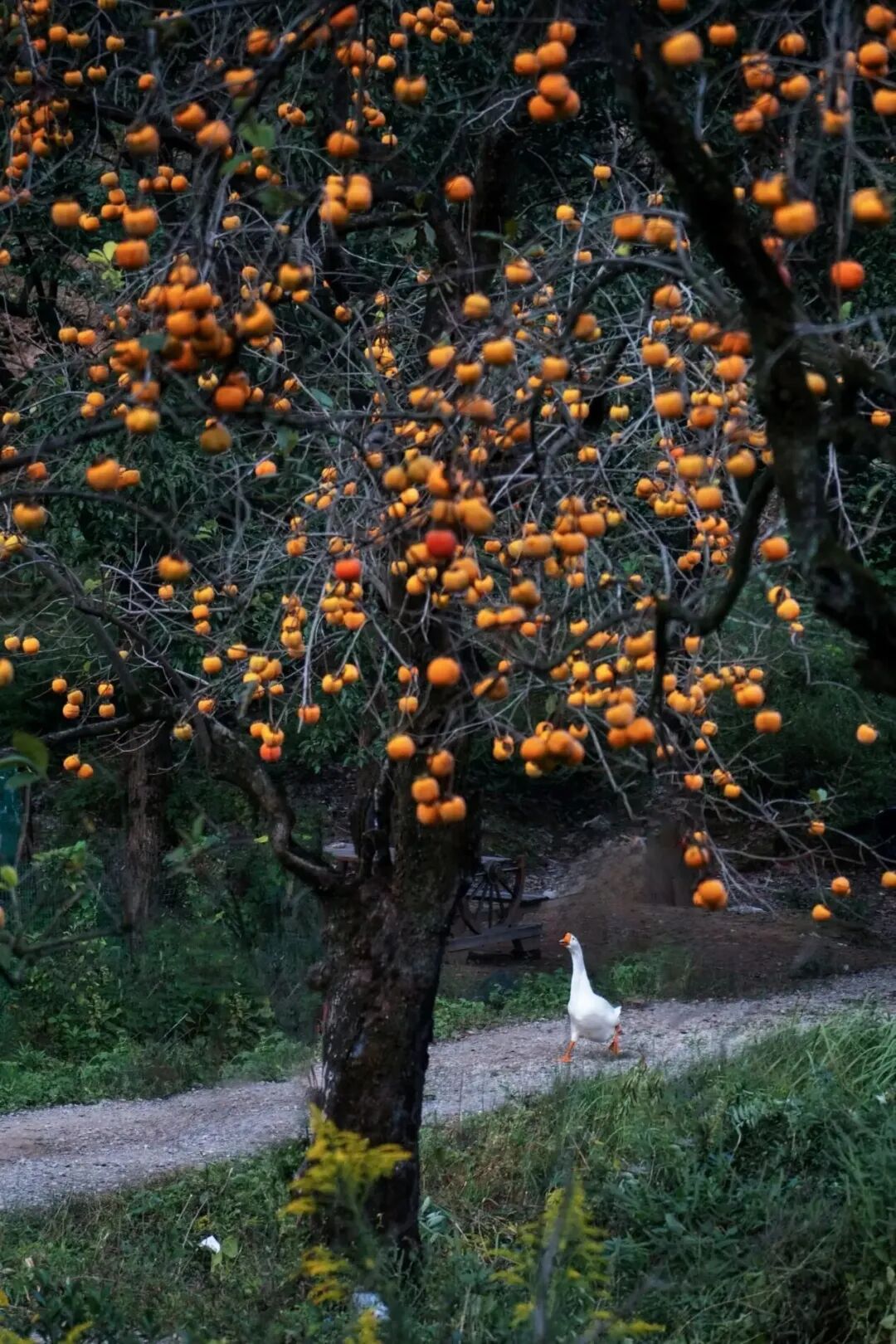 柿子不采摘只供观赏,杭州的赏秋顶流。黄澄澄的“梅里方柿”挂满枝头,1500余棵古柿,几十万颗柿子非常壮观。