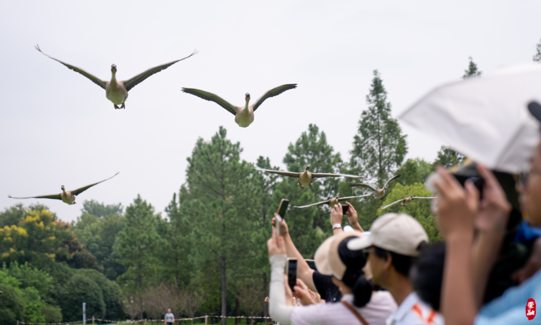 在明珠湖畔举办的大雁放飞表演是华东地区著名的大型珍禽放飞活动,已经成为西沙明珠湖景区的一大亮点,吸引不少游客来此观看。随着工作人员的一声令下,数十只大雁腾空而起,羽翼拍打声回荡在湖面上空,游客们纷纷拿起手机记录下这一精彩瞬间。