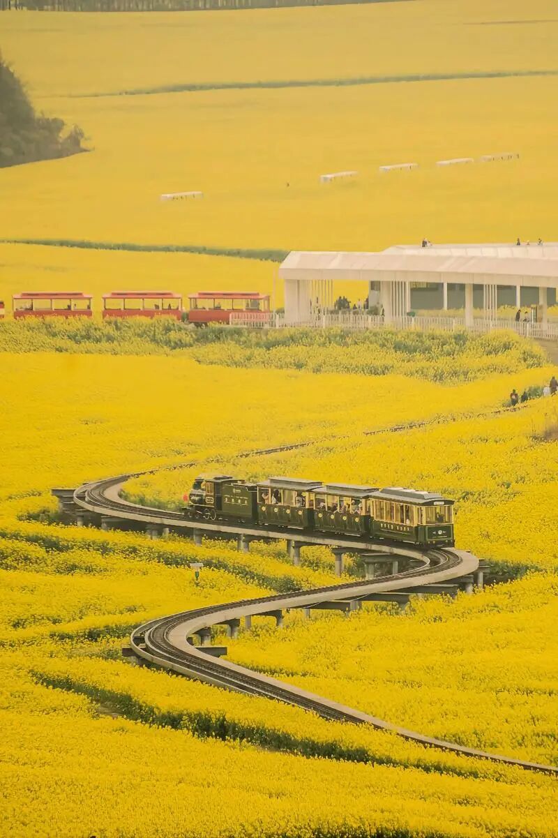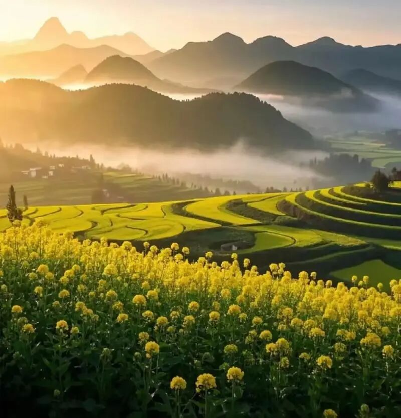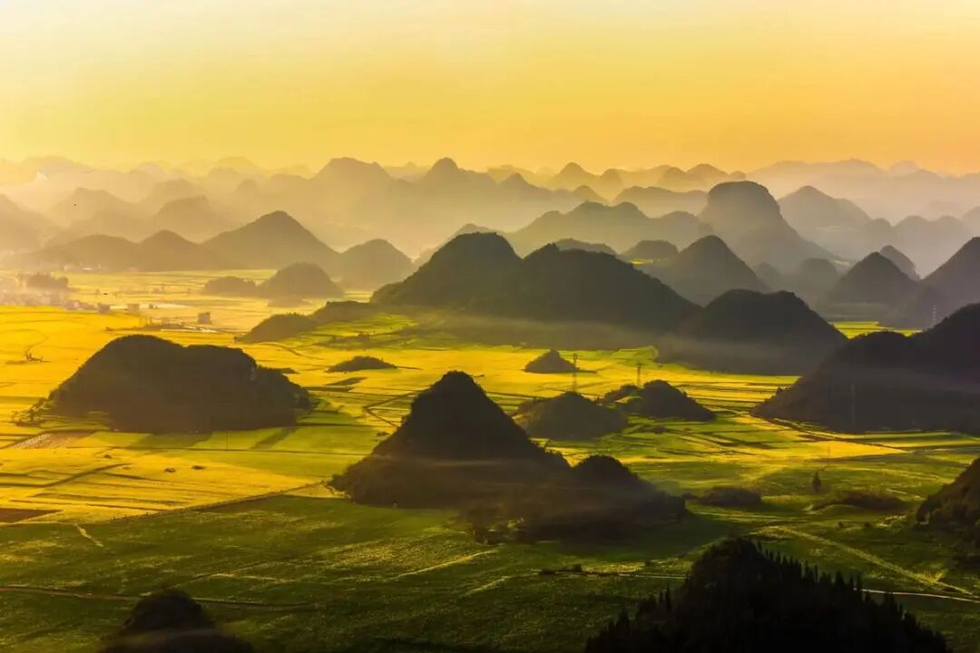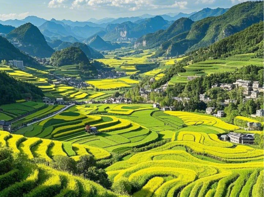 金鸡峰丛属于喀斯特地貌奇观,拥有近百平方公里的峰林区域,无数锥状小山包错落排列。在油菜花盛开时节,金黄色的花海与起伏的峰林、点缀其间的村庄相互映衬,形成了如诗如画的壮观田园风光,视觉冲击力极强。