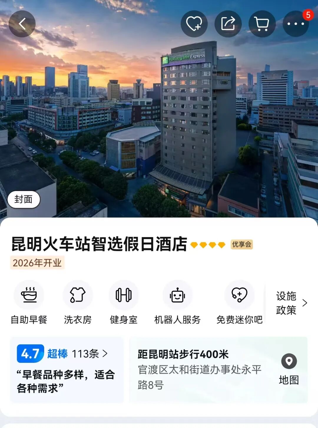 住宿:昆明火车站智选假日酒店或同级