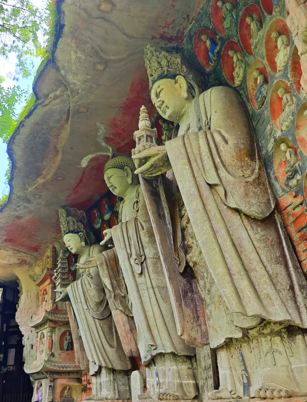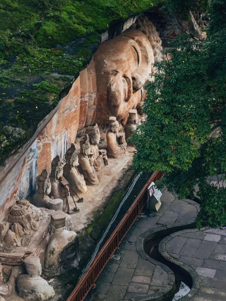 大足石刻的规模超大,它不是分布在一座山上,而是五座山,分别是宝顶山,北山,南山,石篆山,石门山,而其中以宝顶山和北山最为著名。而宝顶山摩崖造像,则几乎集中了大足石刻的精华,也成了绝大多数游客的首选。