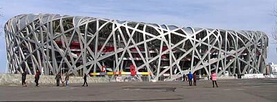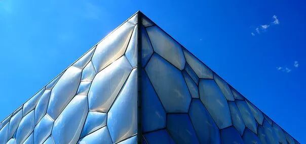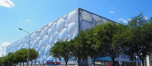“水立方”它的膜结构是世界之最。它是根据细胞排列形式和肥皂泡天然结构设计而成的,这种形态在建筑结构中从来没有出现过,创意十分奇特。