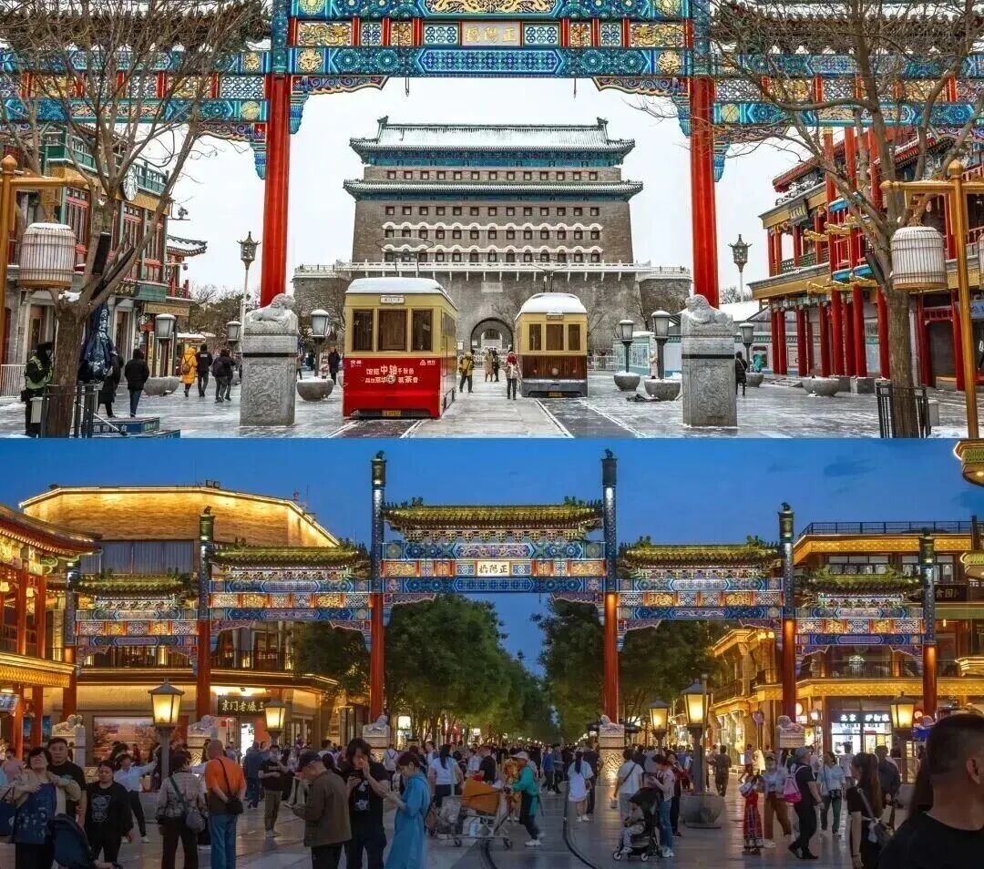 前门大街青石铺路,铛铛车叮当穿行,全聚德、同仁堂等老字号林立,糖葫芦、爆肚香气四溢。