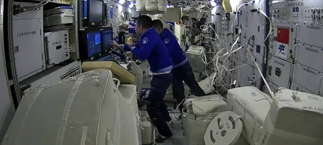 11月4日太空伙食:早餐有粳米粥、椰蓉面包、五香鹌鹑蛋、酱香芥菜等,总共7种食品;中午有8种,包括什锦炒饭、肉丝炒面、土豆牛肉、紫菜蛋花汤等;晚上有8种,有绿豆炒面、牛肉米粉、虾仁鸡蛋、什锦罐头等;加餐有5种,包括麻辣猪肉、蟹黄蚕豆、香辣豆干等。